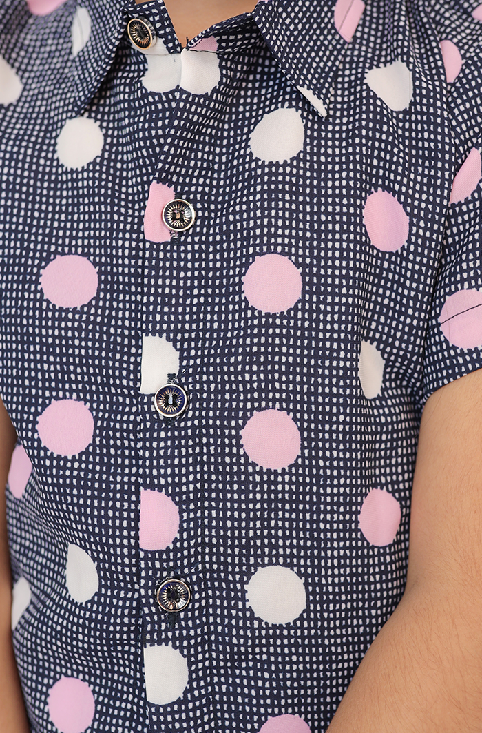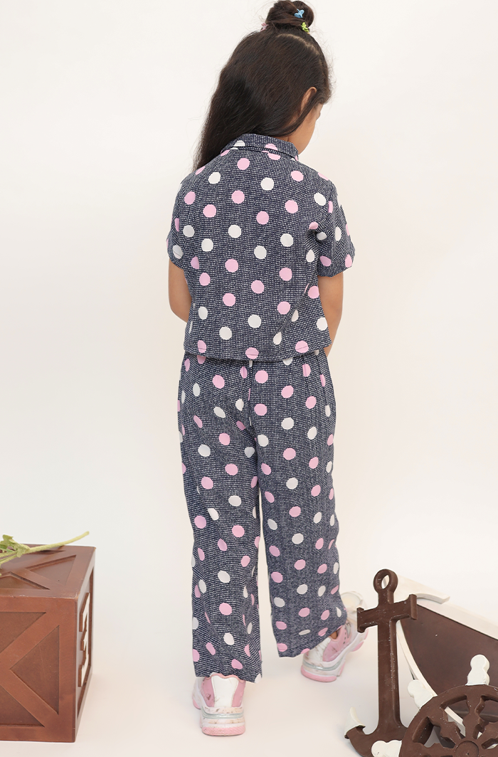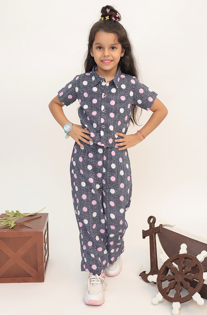 The Black-Pink Crop Shirt and Palazzo Co-Ord Set is a fashionable and fun combination. The outfit includes matching palazzo pants and a black crop top with pink and white polka-dot patterns. Made from soft, breathable cotton, it is comfortable and easy to move in, making it perfect for playdates or everyday wear.