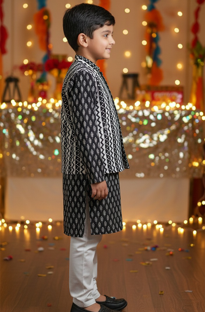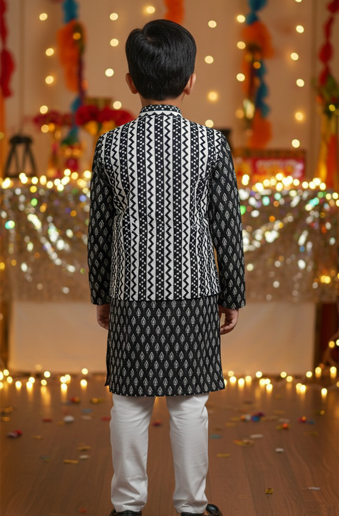 Dress your little one in timeless ethnic charm with this Boy Kurta Pajama Jacket Set in Black. Made from 100% pure cotton, this outfit offers superior comfort while delivering a rich festive look. The beautifully printed kurta paired with a stylish ethnic jacket and classic pajama makes it perfect for special occasions and celebrations.