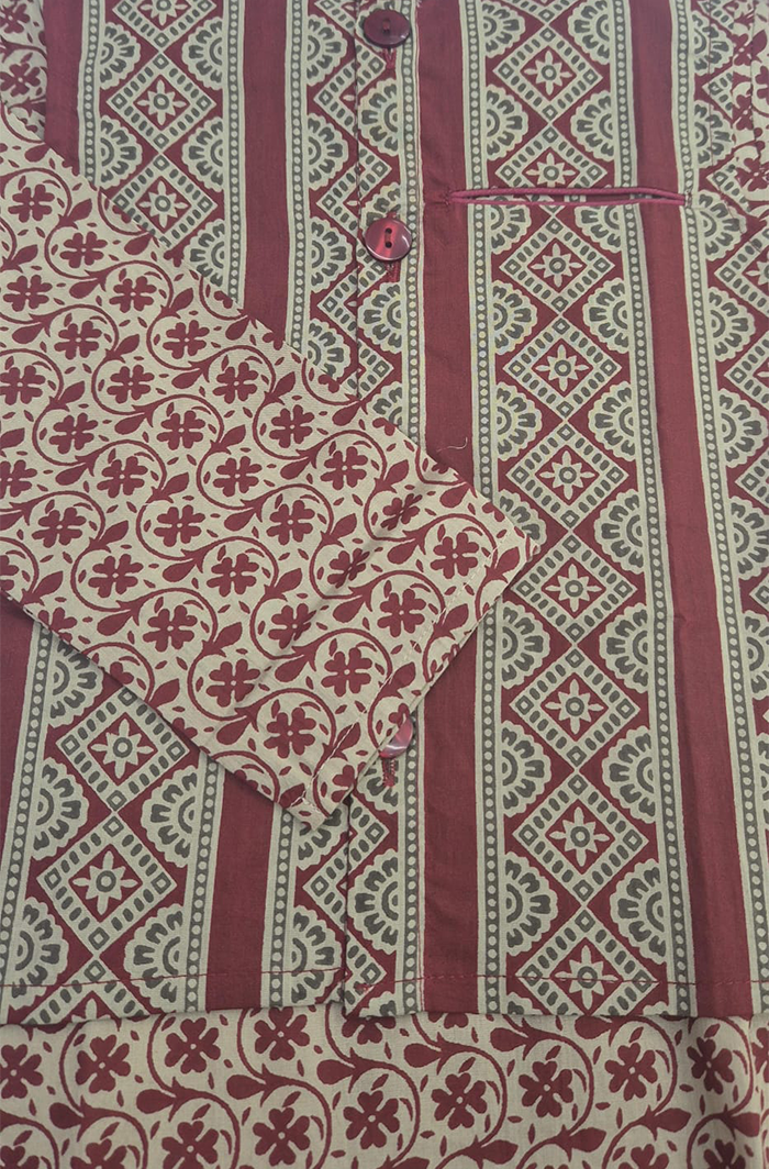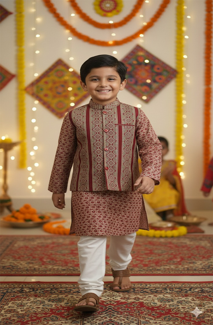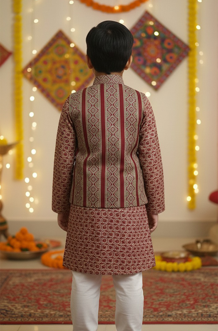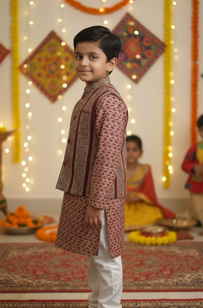 Add timeless festive elegance to your child’s wardrobe with this Boy Kurta Pajama Jacket Set, crafted from 100% pure cotton for comfort and breathability. Featuring a rich maroon printed kurta paired with a matching ethnic jacket and classic pajama, this set offers a perfect blend of traditional charm and easy wear for special occasions.