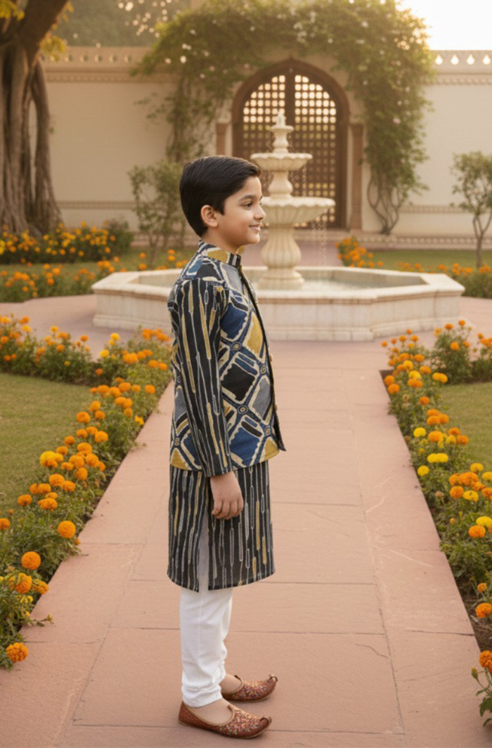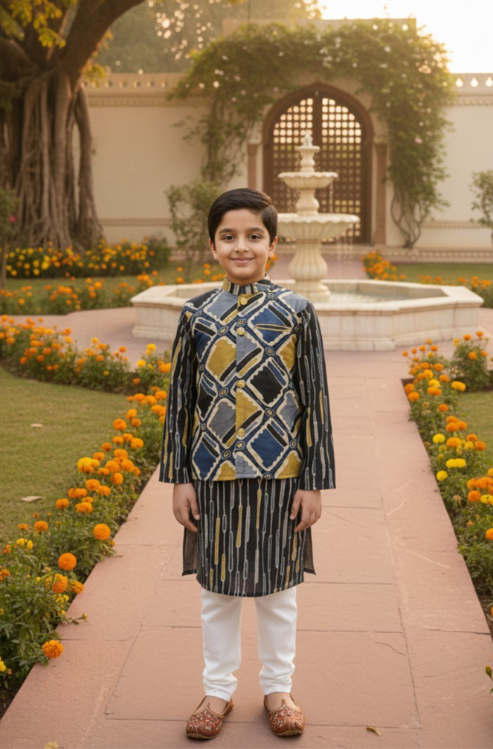 Give your little one a stylish ethnic look with this Boy Cotton Kurta Pajama Jacket Set, crafted from pure cotton for all-day comfort. The classic kurta and pajama are paired with a beautifully printed jacket, adding a festive and modern touch. Designed to be breathable and easy to wear, this set is perfect for celebrations and special occasions.