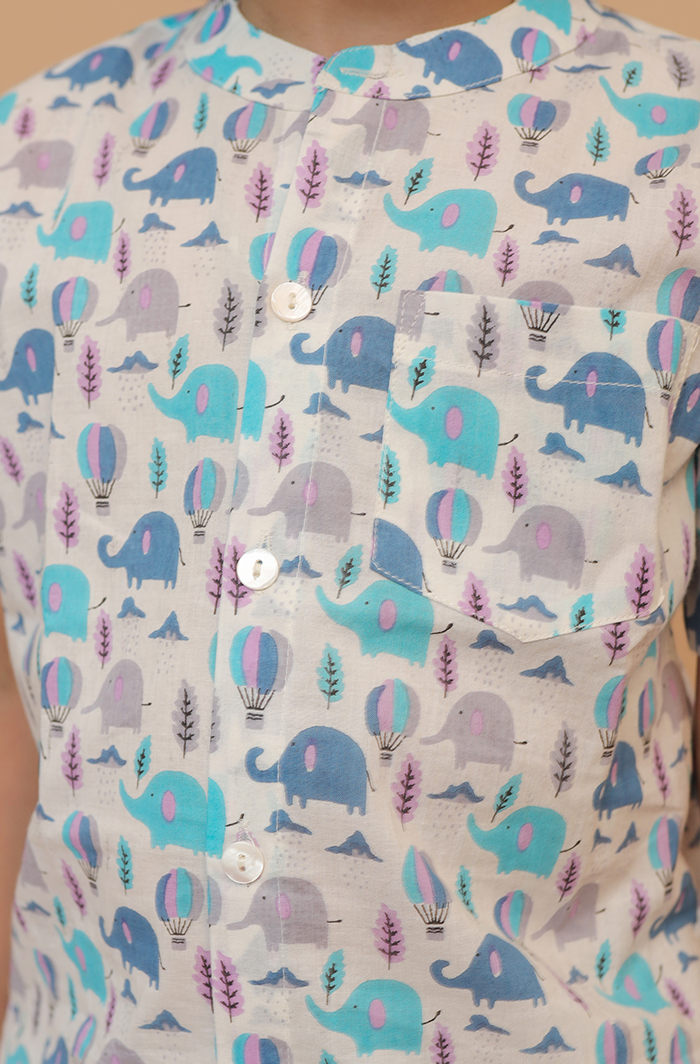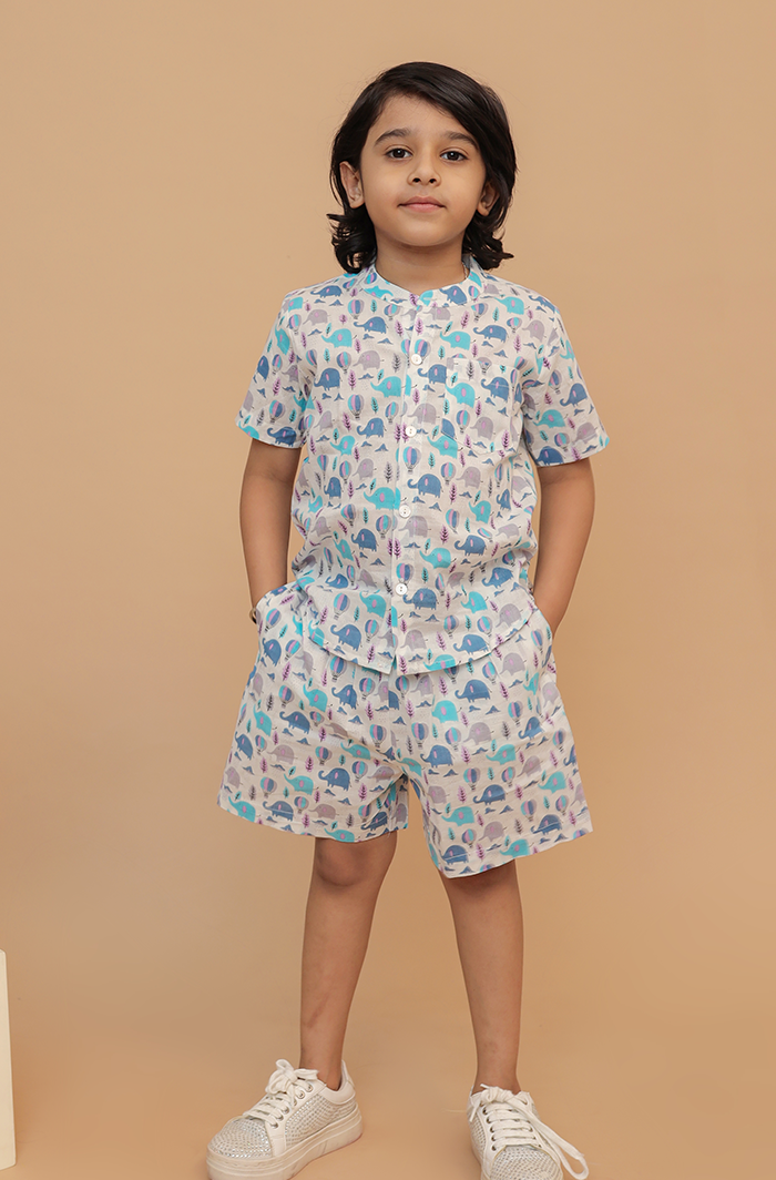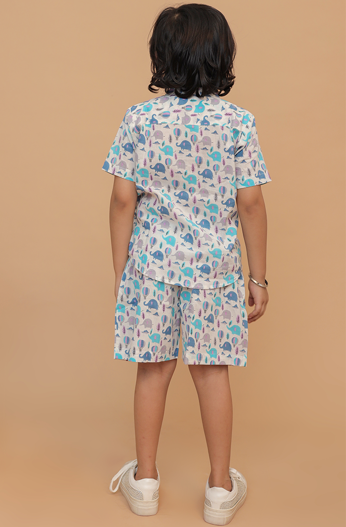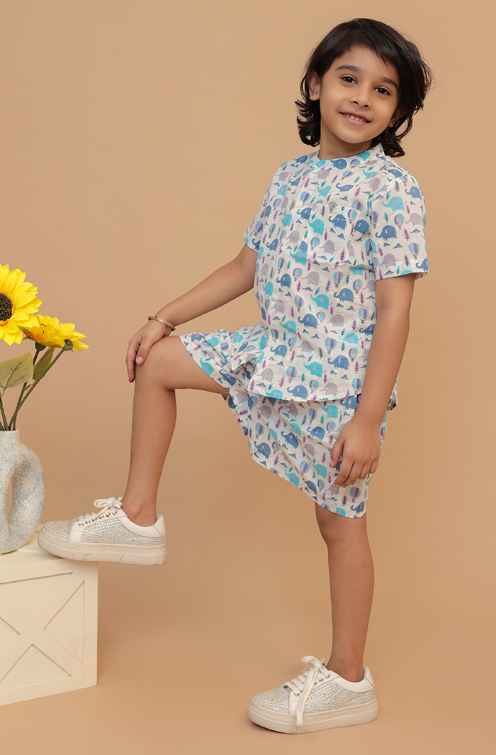 Boy Off-White Blue Half Shirt and Shorts Co-ord Set at Cotton Cuddle Boy Off-White Blue Half Shirt and Shorts Co-ord Set - Cotton Cuddle