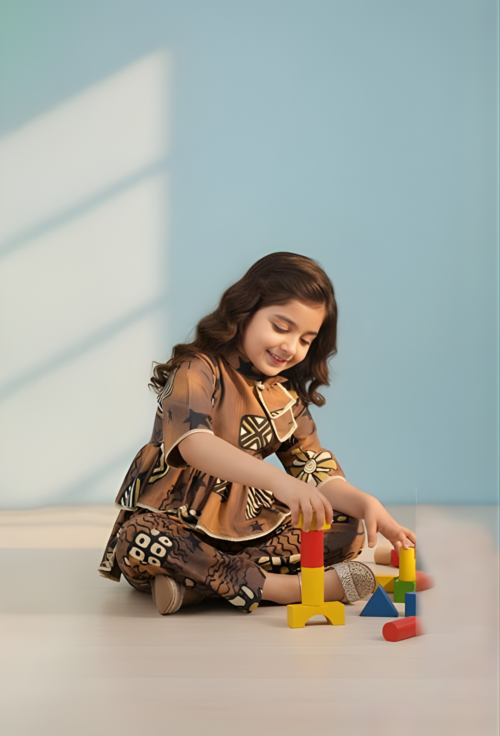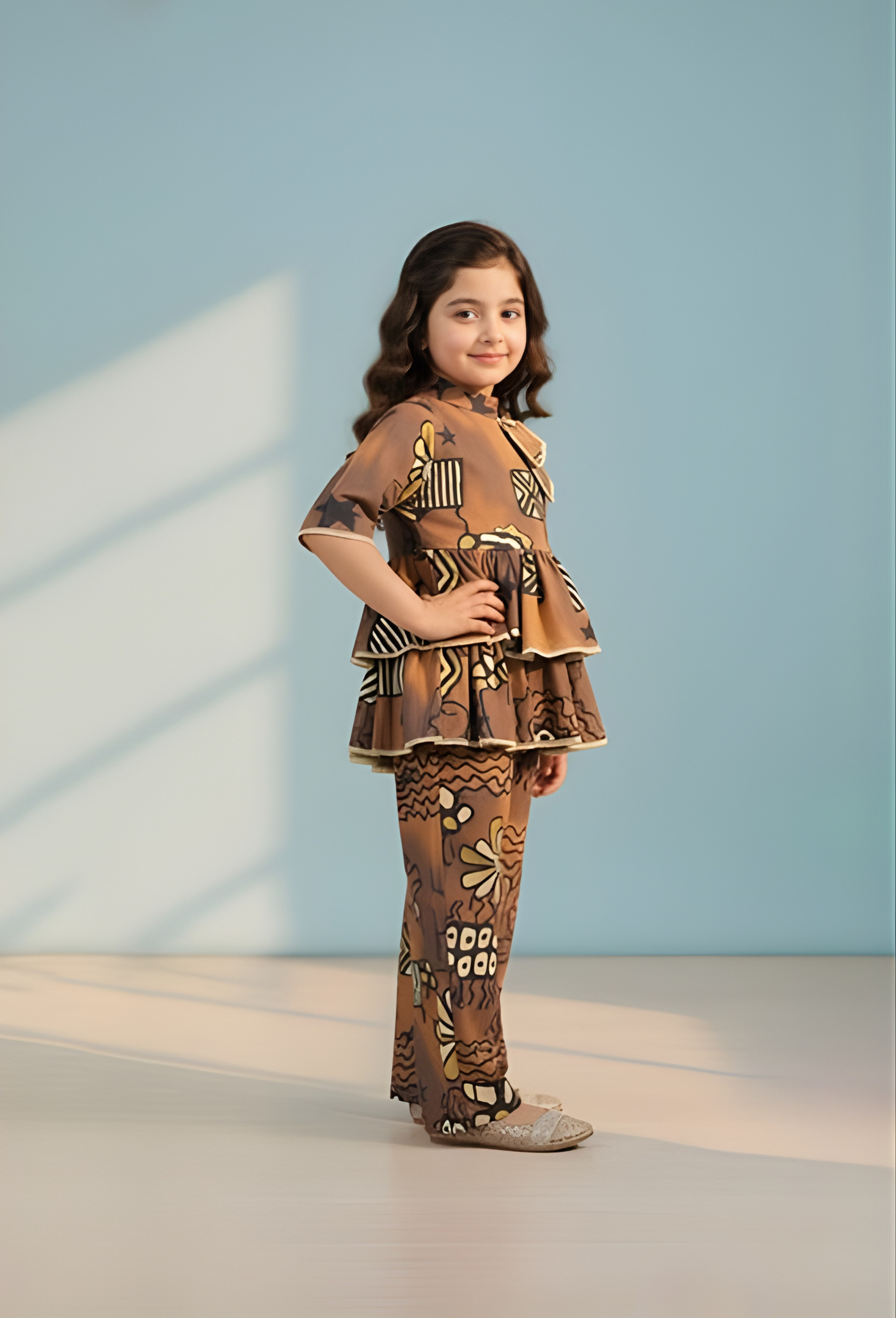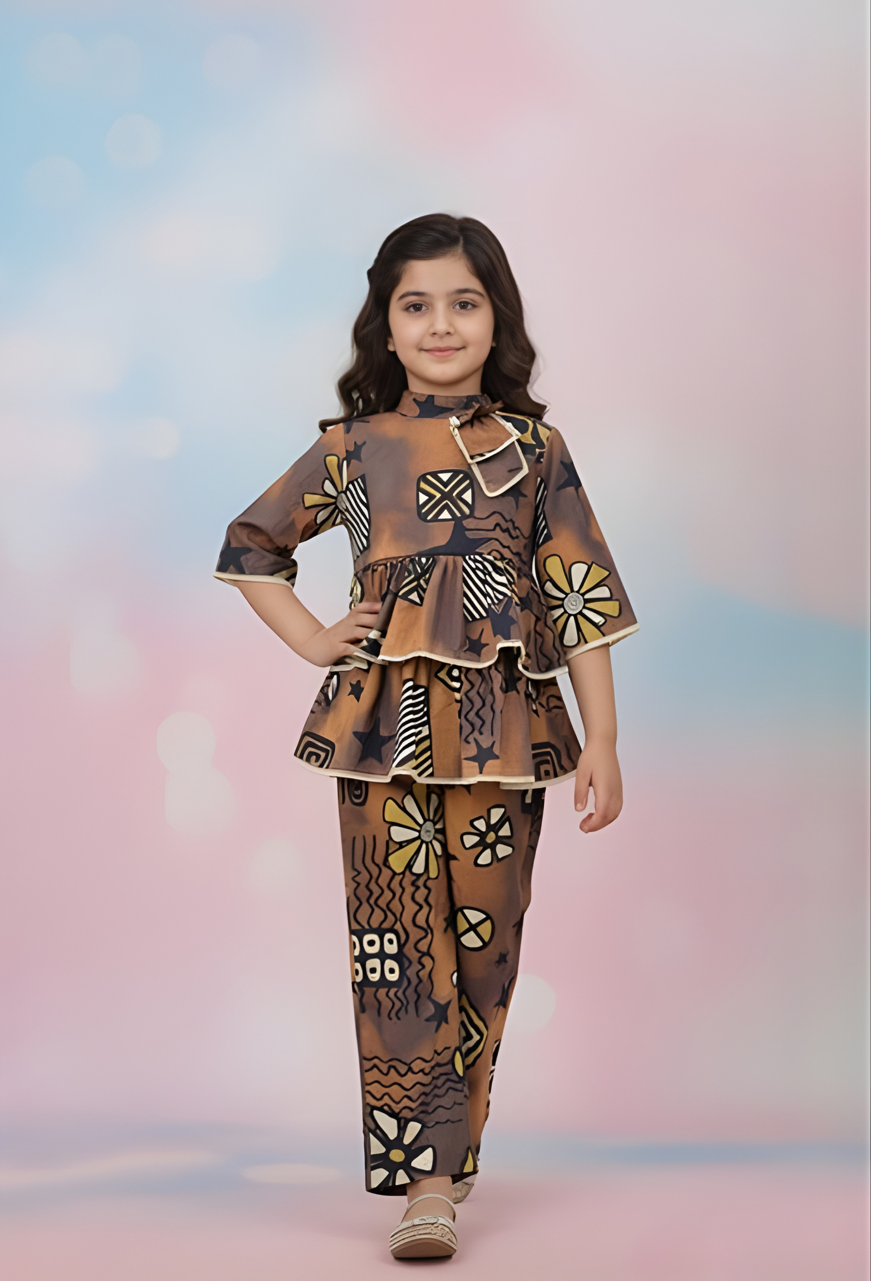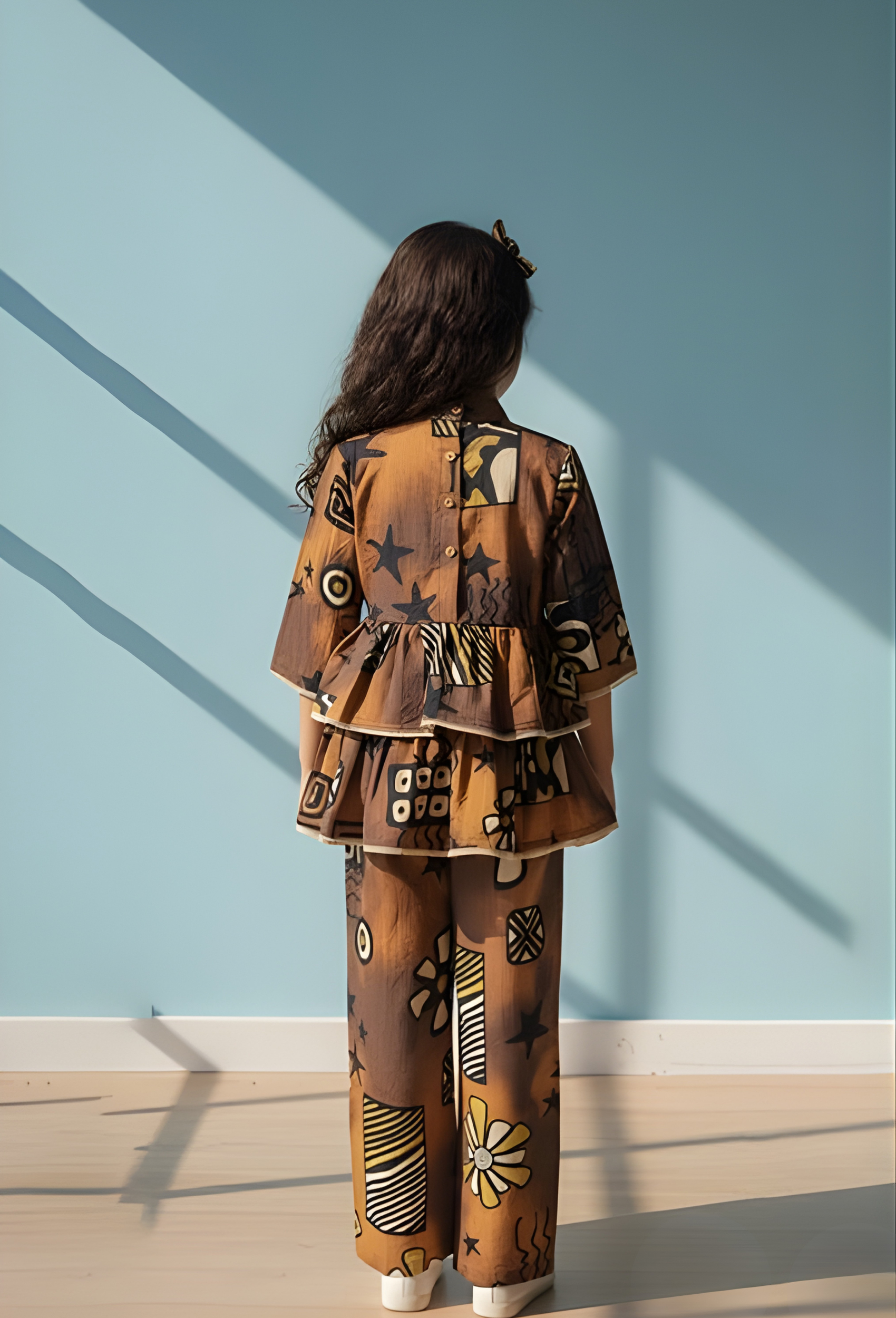 This Brown Flared Co-ord Set keeps girls stylish and comfortable. The flared top with a back opening pairs with matching bottoms for an easy, relaxed fit. Made from soft, breathable cotton, it keeps girls comfortable throughout the day. It is ideal for playing, informal get-togethers, and daily wear considering it’s light and lightweight.
