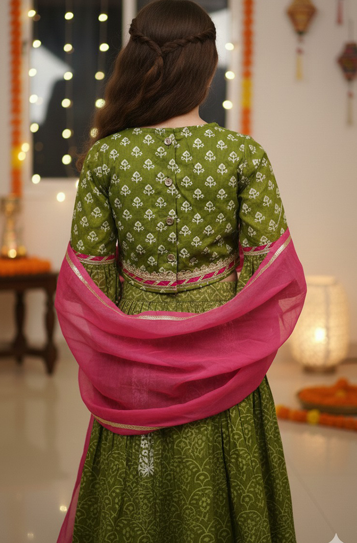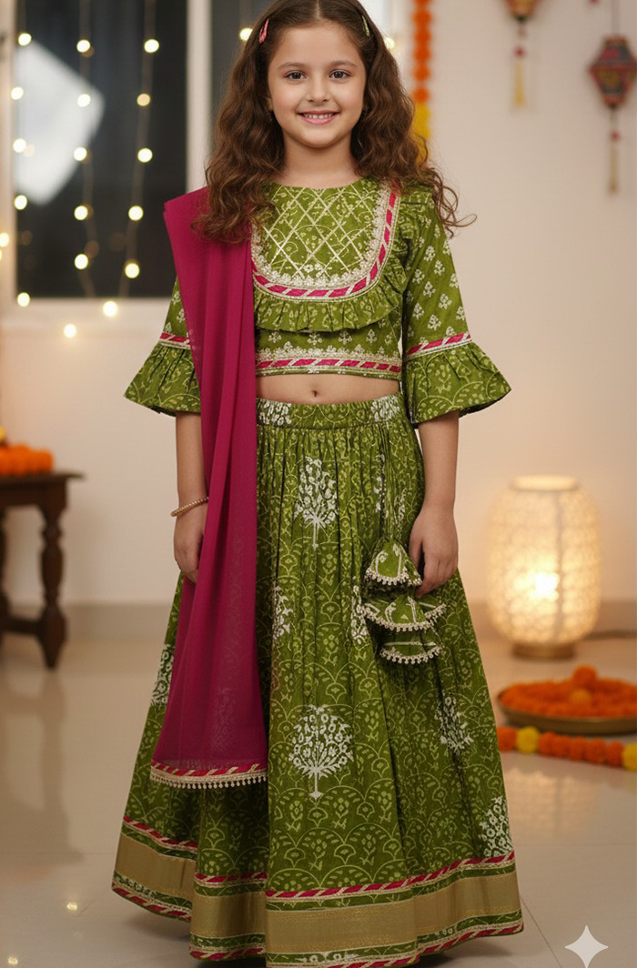 Give your little girl a fresh festive look with this Girl Cotton Ethnic Lehanga Choli Dupatta Set in Green, crafted from soft, breathable cotton for all-day comfort. The beautifully printed lehanga and choli are paired with a lightweight georgette dupatta, creating a graceful ethnic outfit that’s both stylish and easy to wear.
