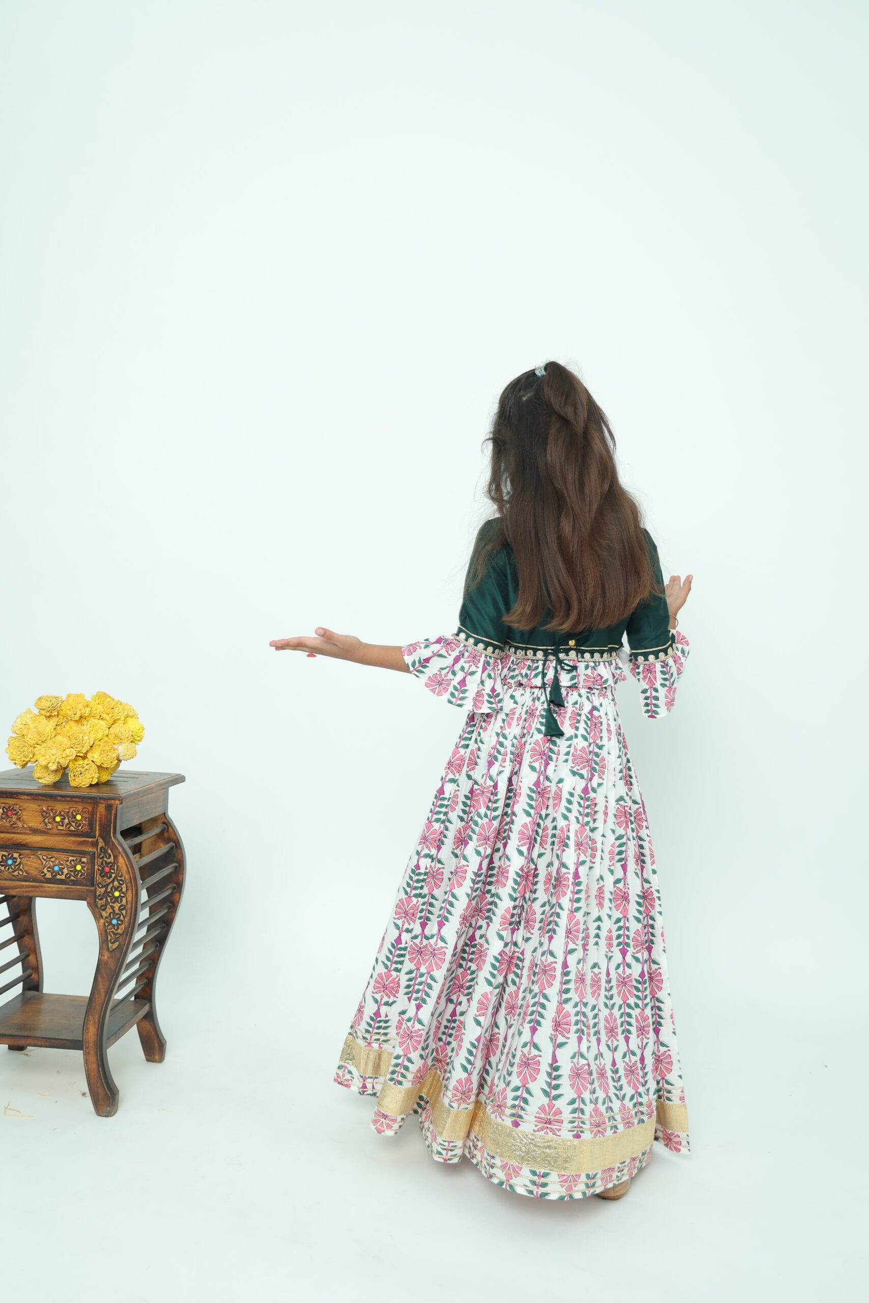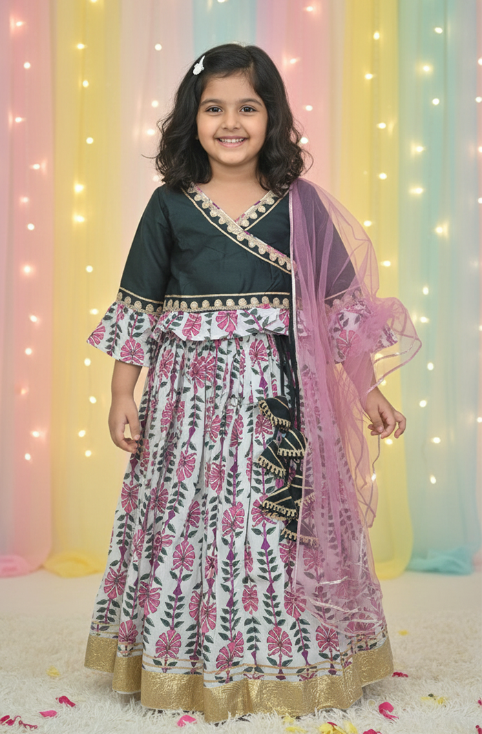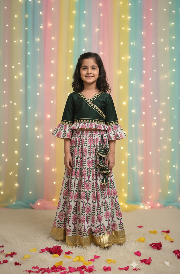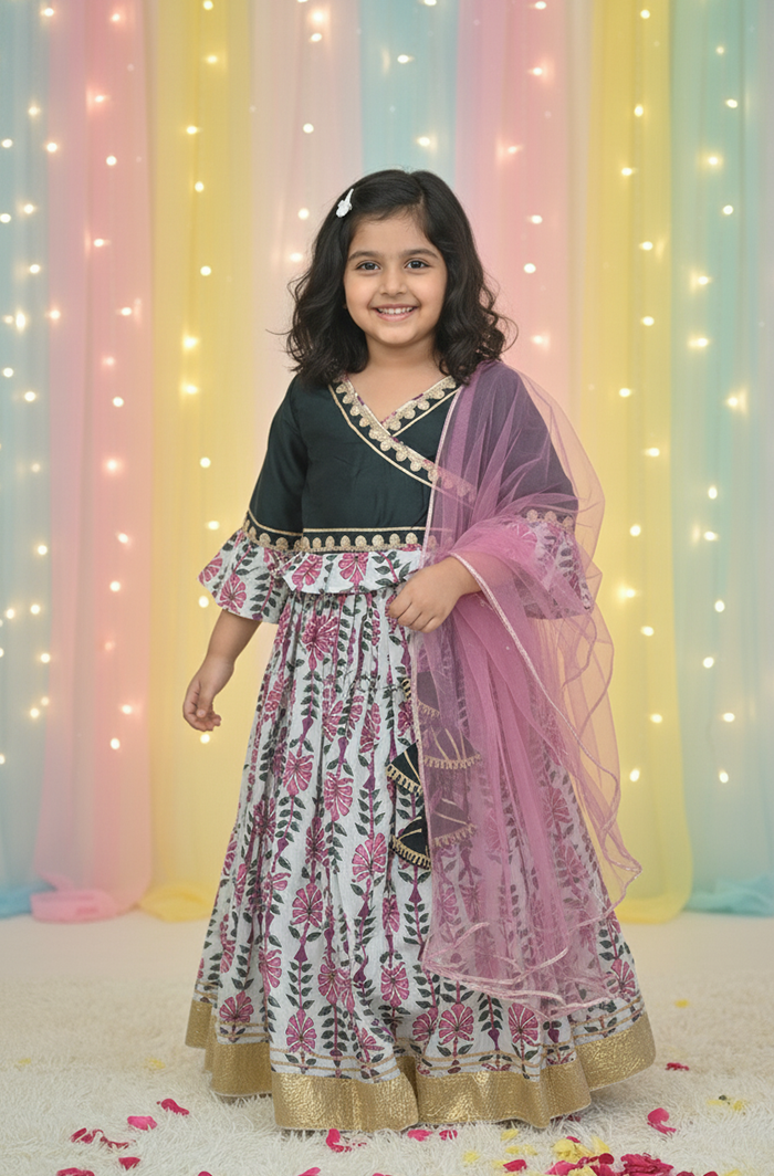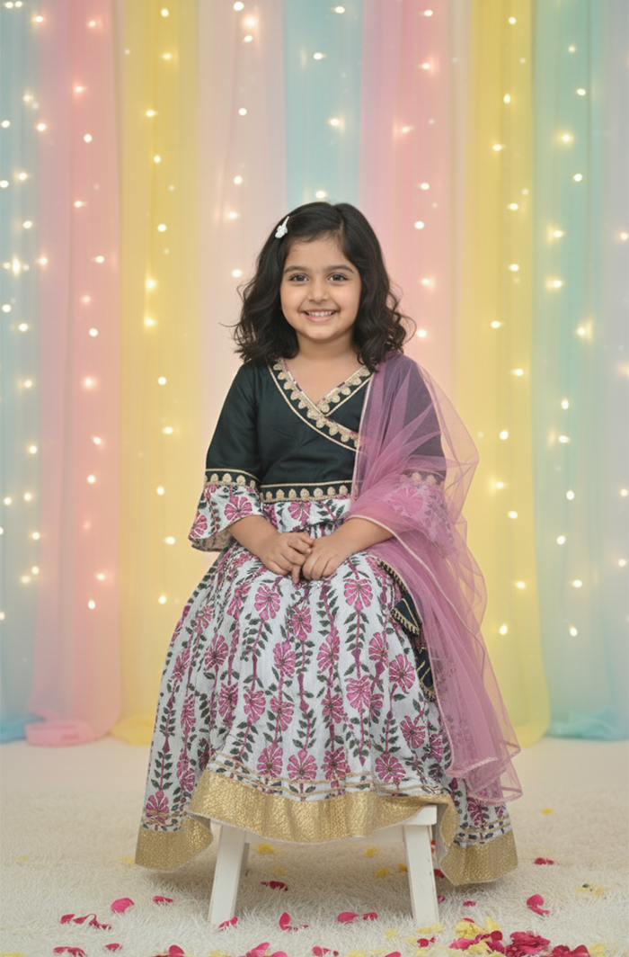 This set blends traditional design with modern flair, look stunning green and pink floral lehenga choli set design to dress your kid beautifully. Its silky fabric ensures all-day comfort, while the rich floral designs in vibrant pink and green tones provide a festive charm to your child’s unique wardrobe.
