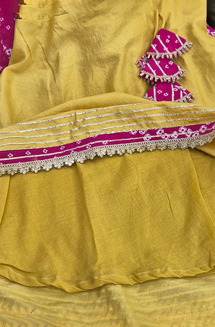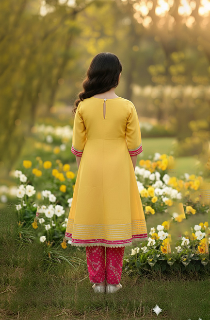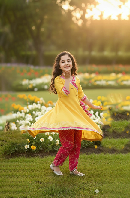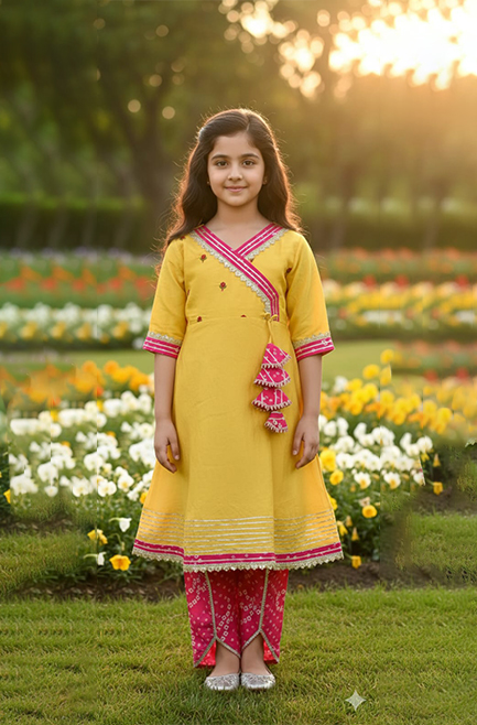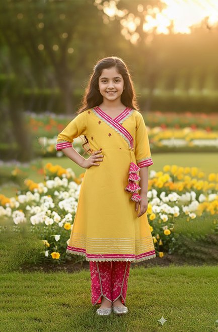 This mustard and fuchsia Angrakha kurti set provides your little girl’s outfit a traditional touch. It looks delicate on the skin and offers all-day comfort because it is made of silky cotton fabric with a smooth cotton mulmul lining. For festivals, family get-togethers and special occasions, the set comes with coordinating bottoms for a loose fit.