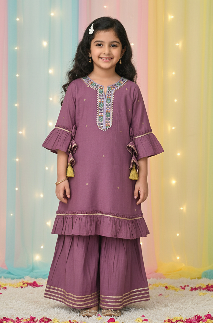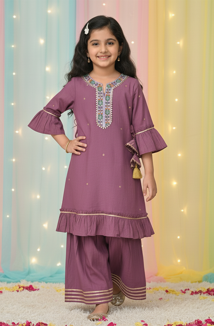 Maroon Kurta and Palazzo Set from Cotton Cuddle blends modern style with traditional elegance. created from soft, breathable cotton, it keeps your child comfortable all day. Embroidery, ruffled sleeves, and tassel details add a festive touch, ideal for family celebrations and cultural events.
