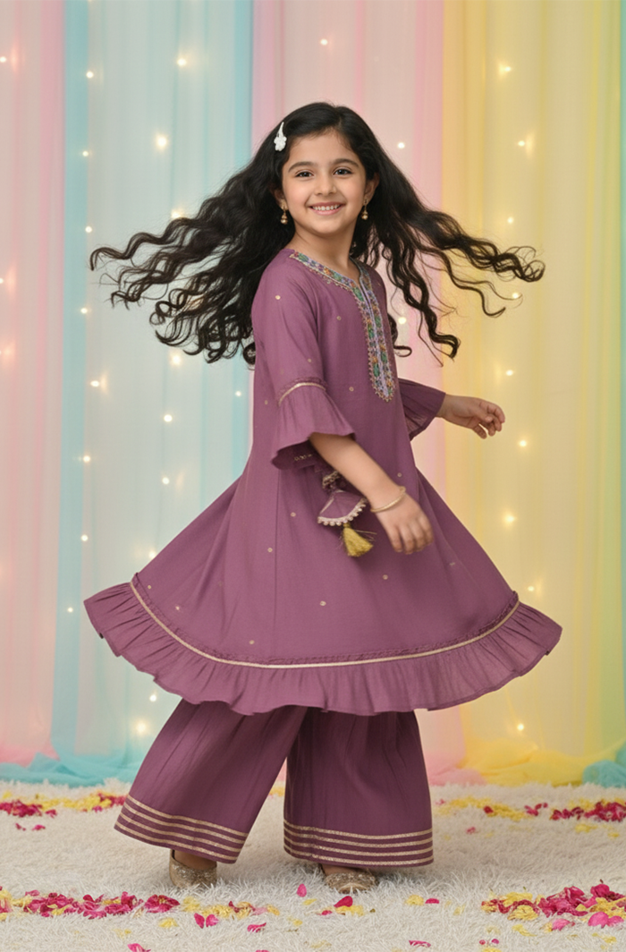 Girls' Traditional Kurta & Palazzo Set – Onion Pink with Roman Silk at Cotton Cuddle Girls' Traditional Kurta & Palazzo Set – Onion Pink with Roman Silk - Cotton Cuddle