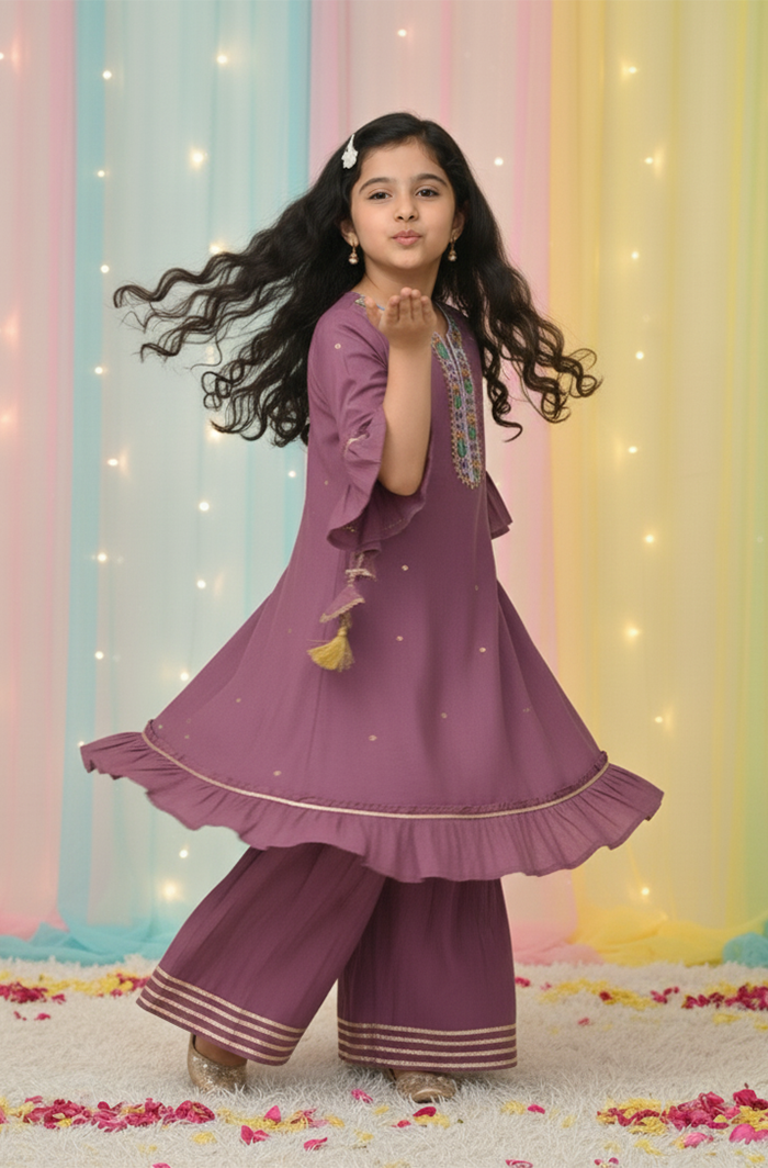 Girls’ Traditional Kurta & Palazzo Set – Onion Pink with Roman Silk