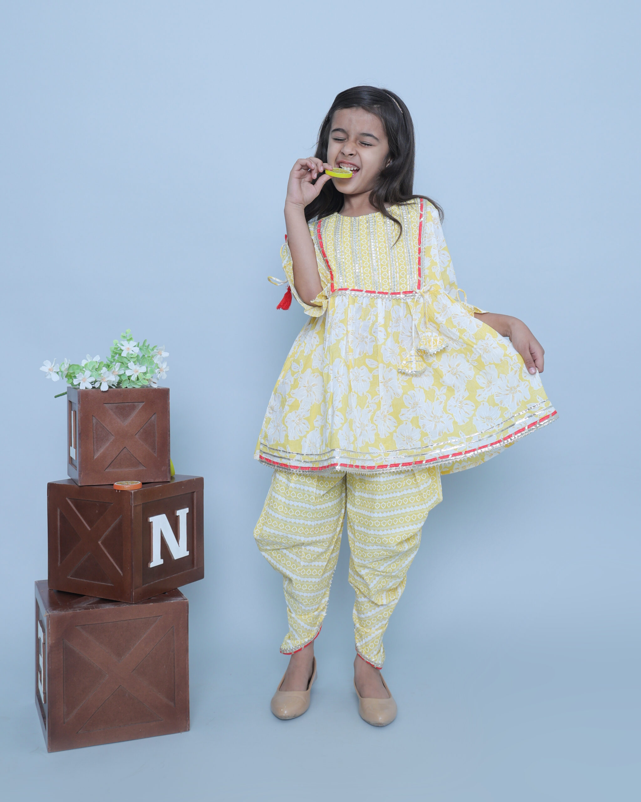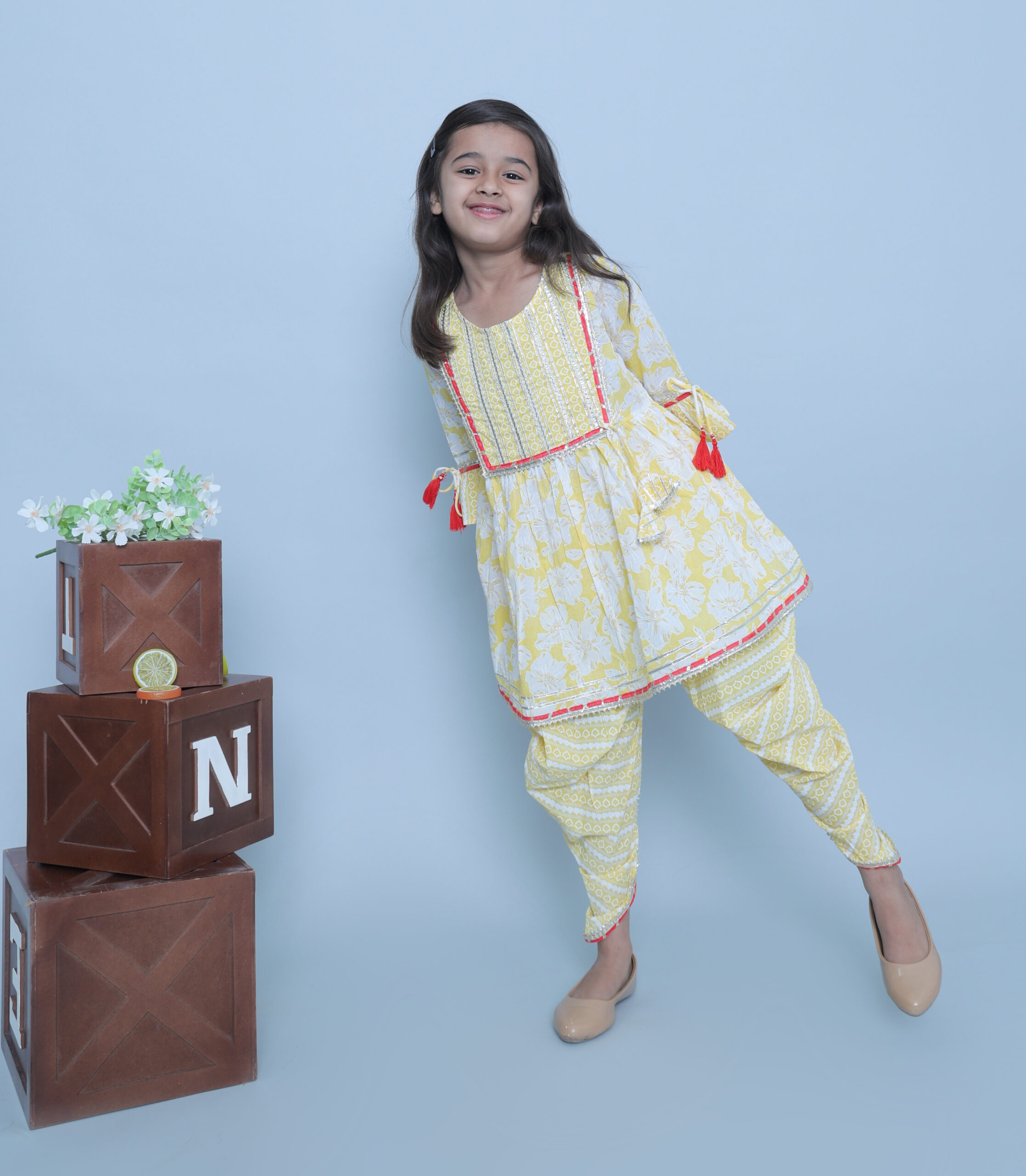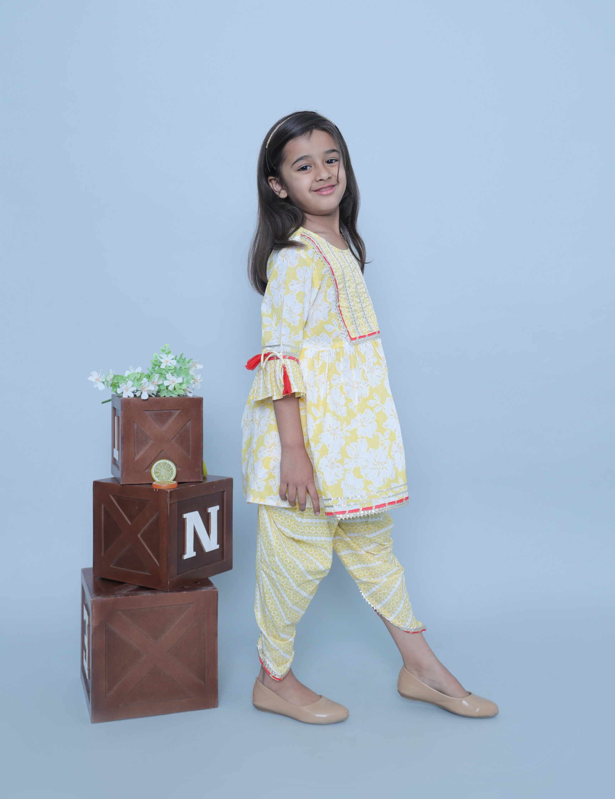 Bring a burst of brightness to your little one’s wardrobe with this vibrant yellow kurta set, adorned in cheerful floral prints and delicate lace details. Finished with playful red tassels and a dhoti-style bottom, it’s a sunny choice for festive flair.