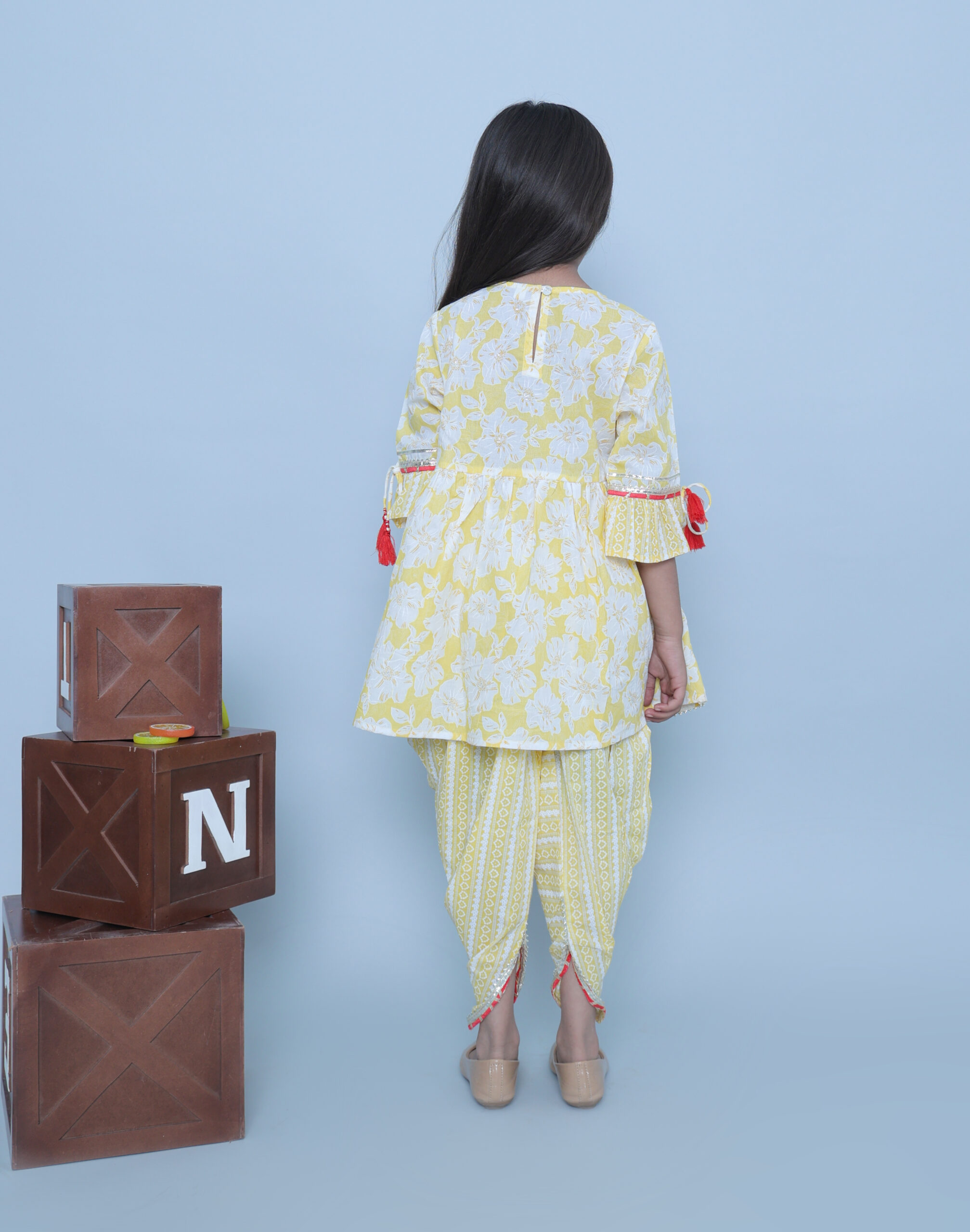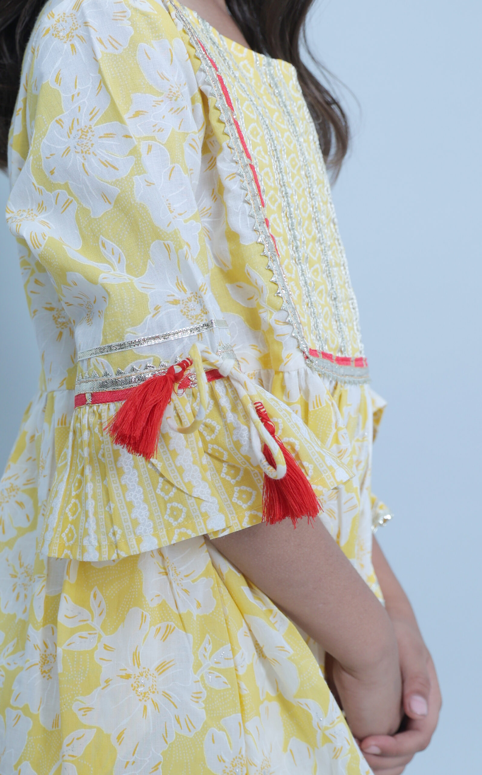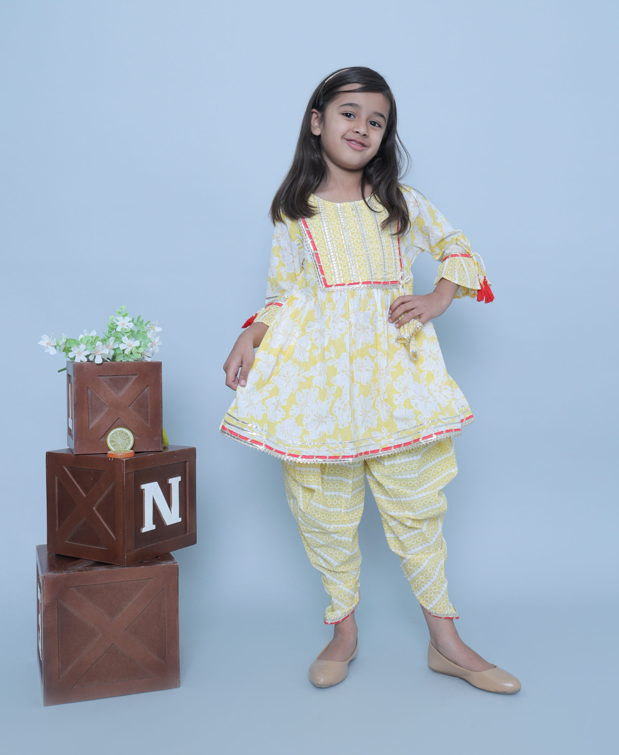 Bring a burst of brightness to your little one’s wardrobe with this vibrant yellow kurta set, adorned in cheerful floral prints and delicate lace details. Finished with playful red tassels and a dhoti-style bottom, it’s a sunny choice for festive flair.