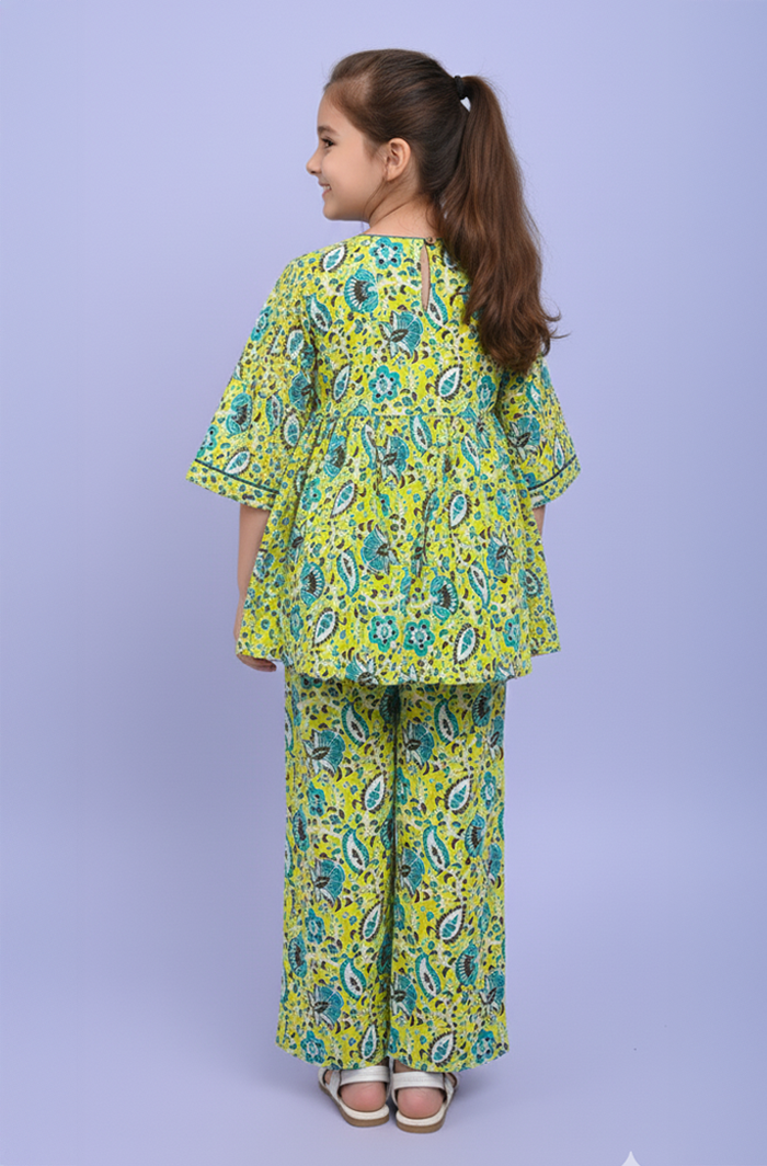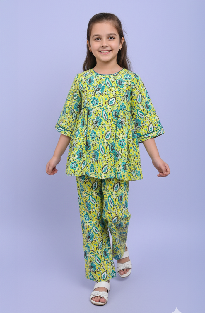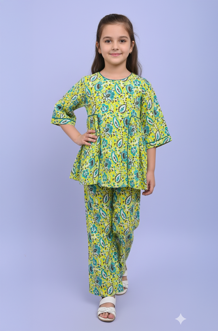 The Light Green Gather Co-ord Set brings together simple style and everyday comfort for girls. It includes a gathered top and matching pants that sit easily and feel good throughout the day. Crafted from soft rayon cotton, the fabric stays light and airy, making this set a reliable pick for playtime, outings, and regular daily wear.
