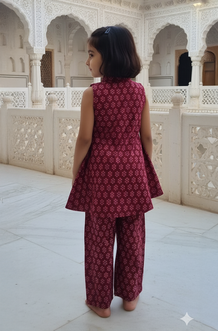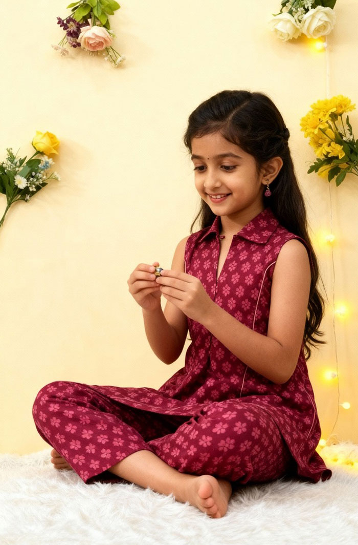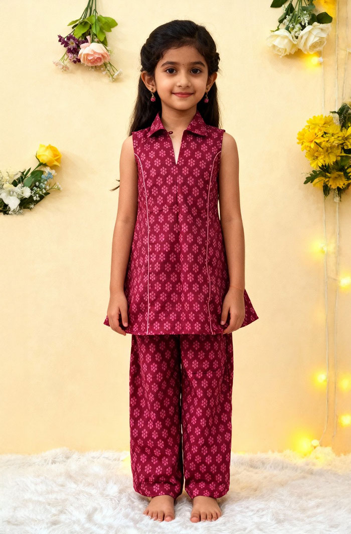 This Maroon Sleeveless Co-ord Set brings together comfort and a neat everyday look for girls. The soft cotton fabric feels light on the skin, and the sleeveless top paired with matching shorts gives a relaxed fit that’s easy to wear through the day. Its airy design makes it a handy choice for playtime, short outings, or regular daily use.
