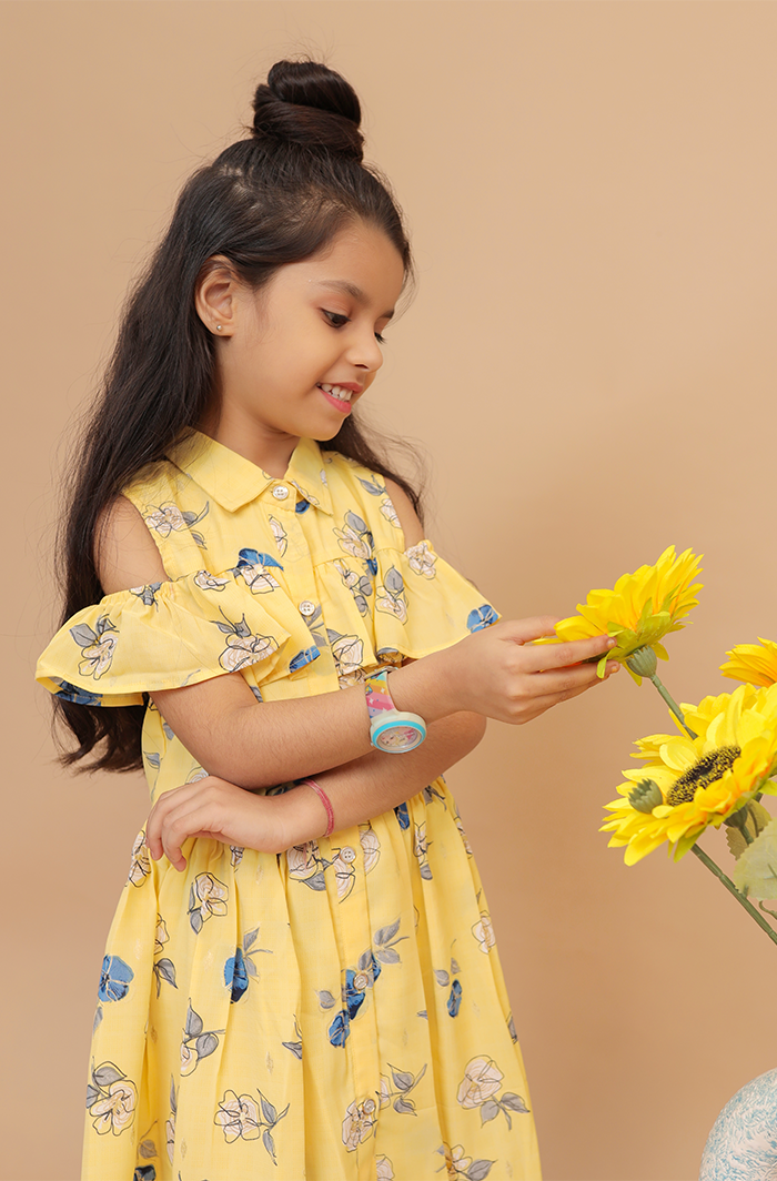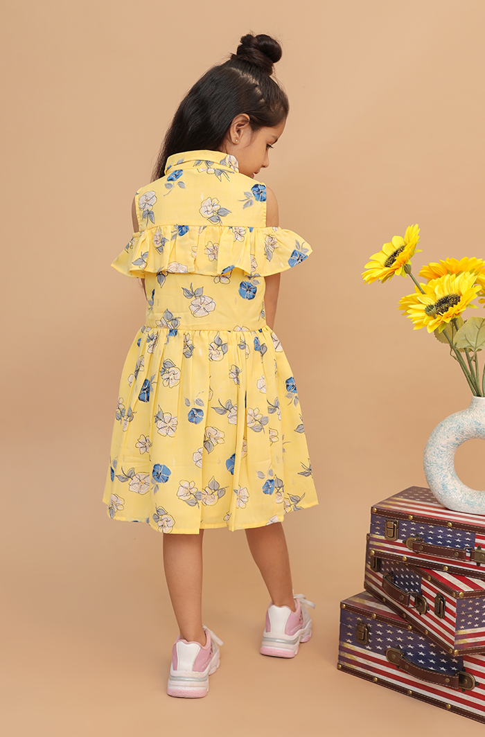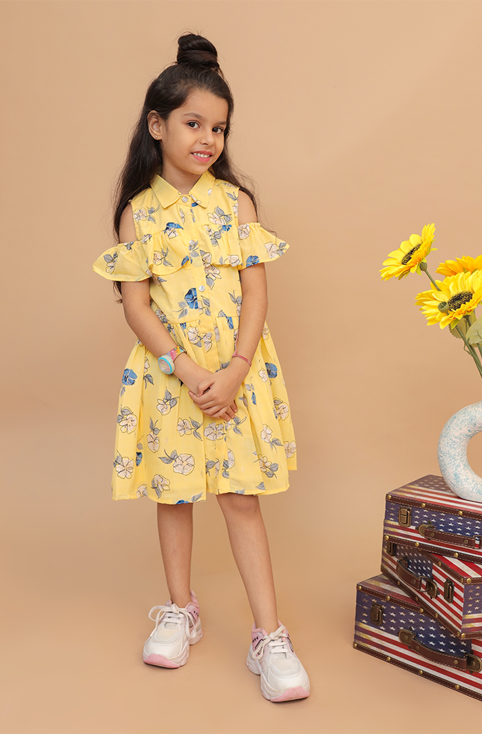 Yellow Off-Shoulder Frill Dress/Frock at Cotton Cuddle Yellow Off-Shoulder Frill Dress/Frock - Cotton Cuddle