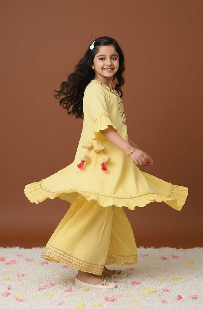 This set blends traditional design with modern look, showcasing a charming yellow layered dress with tassel accents to dress your kid beautifully. Its soft, breathable fabric allows all-day comfort, while the delicate tassels and ruffled layers provide a festive charm to your child’s unique wardrobe.